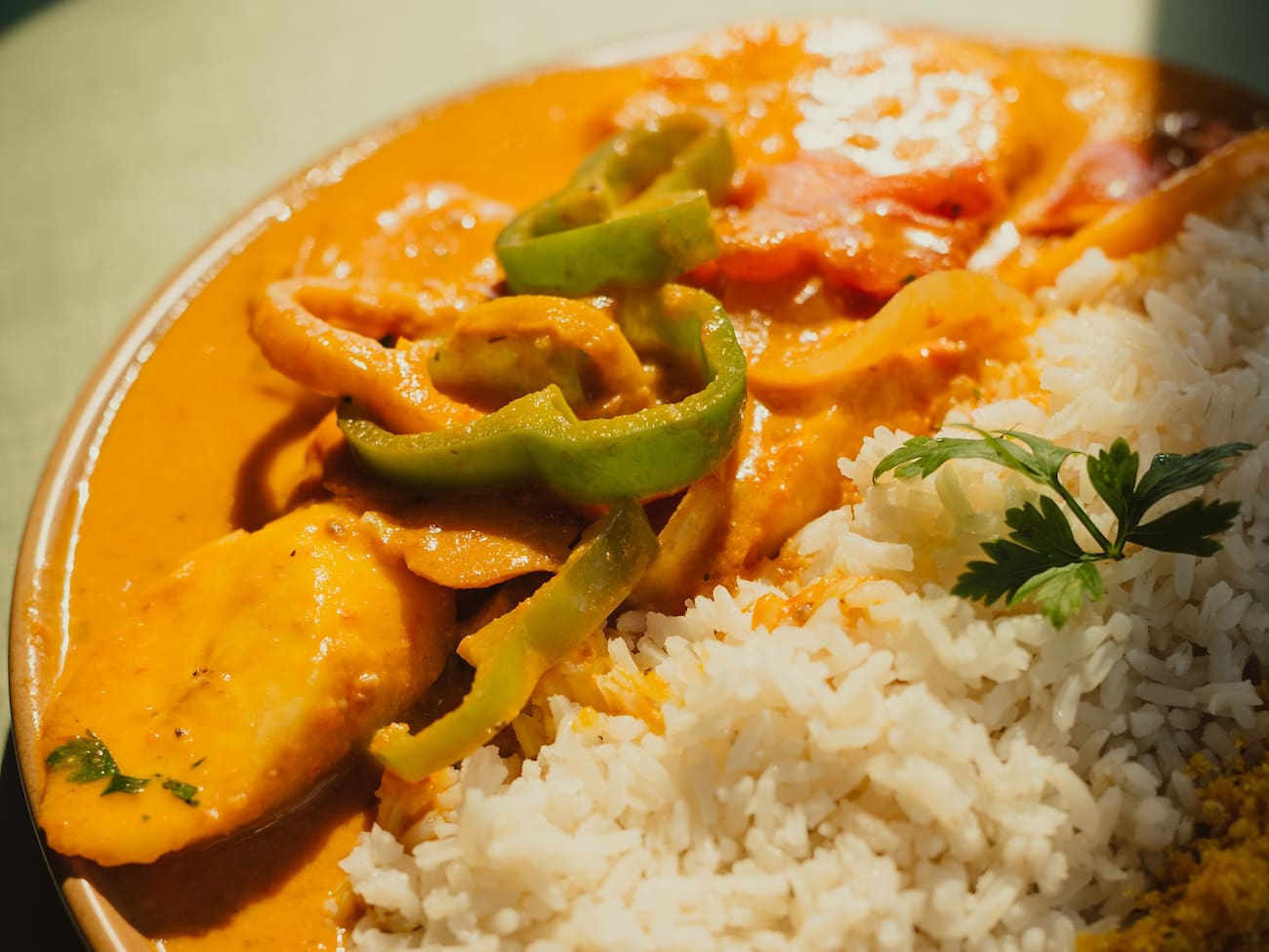 Moqueca de banana da terra acompanhado de arroz branco e farofinha de cenoura e ervilhas.